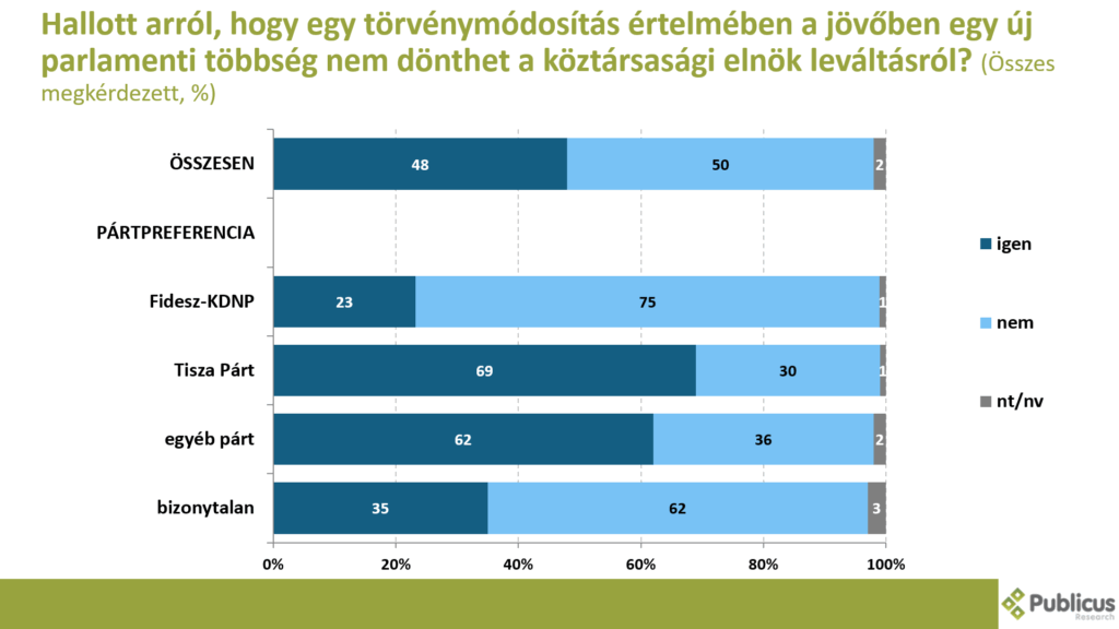 Minden második (48 százalék) válaszadó hallott arról, hogy egy törvénymódosítás értelmében a jövőben egy új parlamenti többség nem dönthet a köztársasági elnök leváltásról. Így nyilatkozott a Tisza Párt szavazóinak a 69 százaléka, a bizonytalan szavazók 35 százaléka, illetve a Fidesz szavazók 23 százaléka.