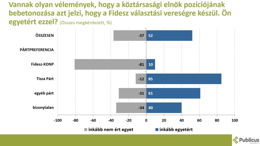 Vannak olyan vélemények, hogy a köztársasági elnök pozíciójának bebetonozása azt jelzi, hogy a Fidesz választási vereségre készül. A válaszadók enyhe többsége (52 százalék) inkább egyetért ezzel az állítással. Így nyilatkozott a Tisza Párt szavazóinak a 85 százaléka, a bizonytalan szavazók 40 százaléka, illetve a Fidesz szavazók 10 százaléka.