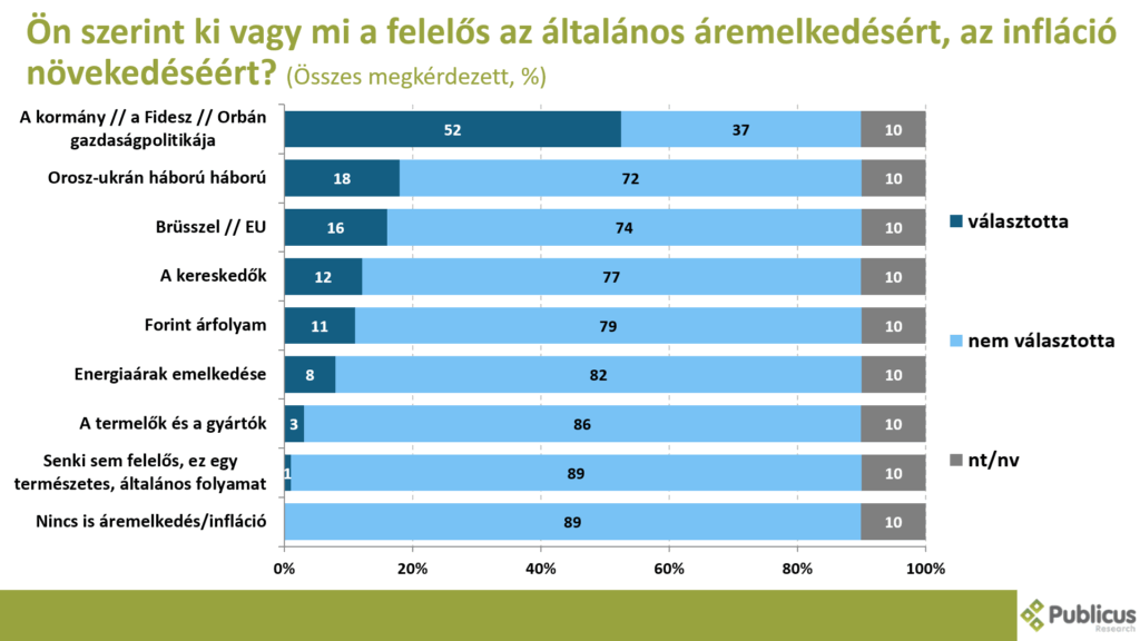 A többség (52 százalék) úgy nyilatkozott, hogy szerintük a kormány // a Fidesz // Orbán gazdaságpolitikája felelős az általános áremelkedésért, az infláció növekedéséért.