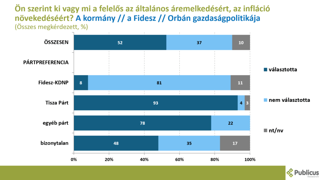 A Tisza Párt szavazóinak a 93 százaléka, a bizonytalan szavazók 48 százaléka, illetve a Fidesz szavazók 8 százaléka szerint a kormány // a Fidesz // Orbán gazdaságpolitikája a felelős az általános áremelkedésért, az infláció növekedéséért.