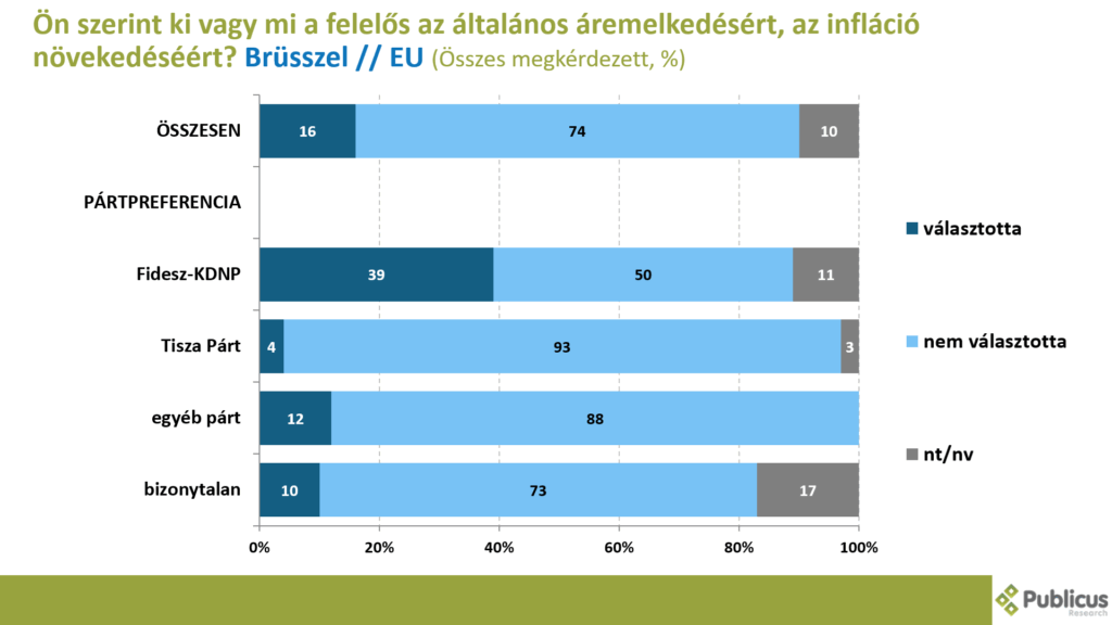 A Fidesz szavazók 39 százaléka, a bizonytalan szavazók 10 százaléka, illetve a Tisza Párt szavazóinak a 4 százaléka szerint Brüsszel // az Európai Unió a felelős az általános áremelkedésért, az infláció növekedéséért.