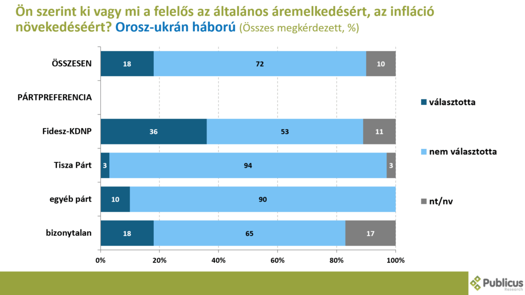 A Fidesz szavazók 36 százaléka, a bizonytalan szavazók 18 százaléka, illetve a Tisza Párt szavazóinak a 3 százaléka szerint az Orosz-ukrán háború a felelős az általános áremelkedésért, az infláció növekedéséért.