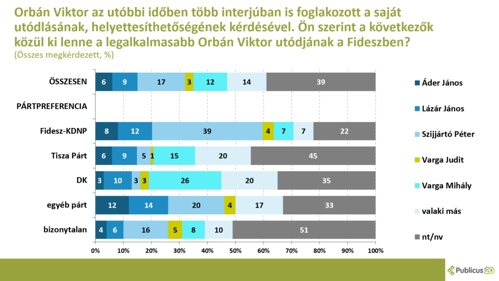 A Fidesz szavazók relatív többsége (39 százalék) Szijjártó Pétert tartja Orbán legalkalmasabb utódjának. Más pártoknál még Varga Mihály ért el relatív jó eredményeket (A DK-nál 26 százalékot, a Tisza Pártnál 15 százalékot).