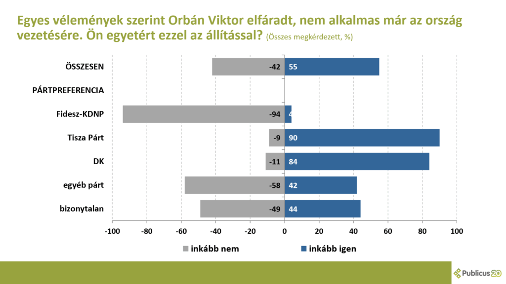 A többség (55 százalék) inkább egyetért azzal az állítással, hogy Orbán Viktor elfáradt, nem alkalmas már az ország vezetésére. Így nyilatkozott a Tisza Párt szavazóinak a 90 százaléka, a DK szavazók 84 százaléka, a bizonytalan szavazók 44 százaléka, illetve a Fidesz szavazók 4 százaléka.