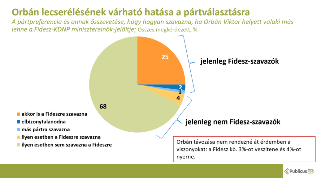 A megkérdezettek 68 százaléka Orbán lecserélése esetében sem szavazna a Fideszre, 4 százalék azonban ilyen esetben már hajlandó lenne a mostani kormánypártra szavazni.