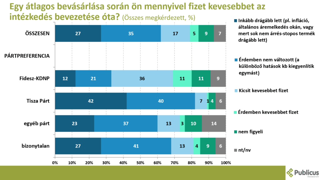 Tízből közel három (27 százalék) válaszadó úgy tapasztalja, hogy az intézkedés bevezetése óta egy átlagos bevásárlás inkább drágább lett (pl: infláció, általános áremelkedés okán, vagy mert sok nem árrés-stopos termék drágább lett). Így nyilatkozott a Tisza Párt szavazóinak a 42 százaléka, a bizonytalan szavazók 27 százaléka, illetve a Fidesz szavazók 12 százaléka.
