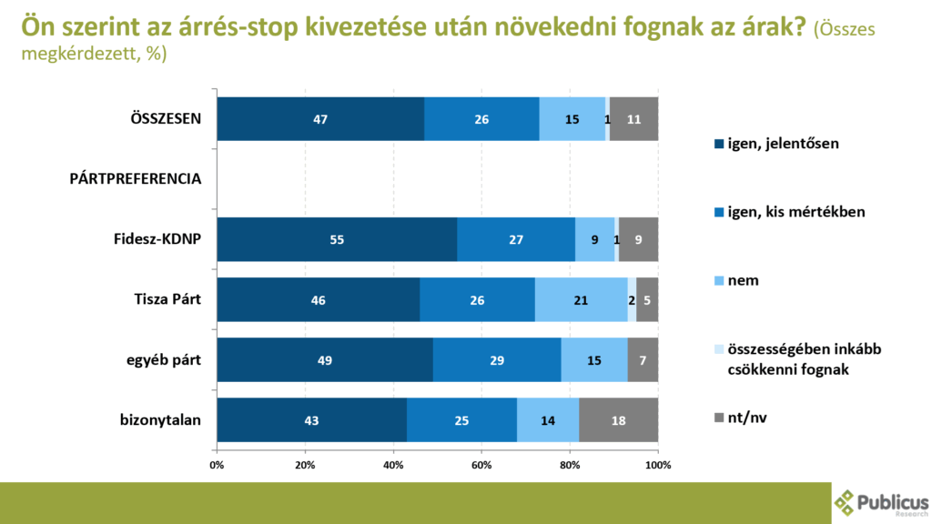 A válaszadók háromnegyede (73 százalék) szerint az árrés-stop kivezetése után vagy jelentősen (47 százalék), vagy pedig kis mértékben (26 százalék) fognak növekedni az árak. Így gondolja a Fidesz szavazók 82 százaléka, a Tisza Párt szavazóinak a 72 százaléka, illetve a bizonytalan szavazók 68 százaléka.