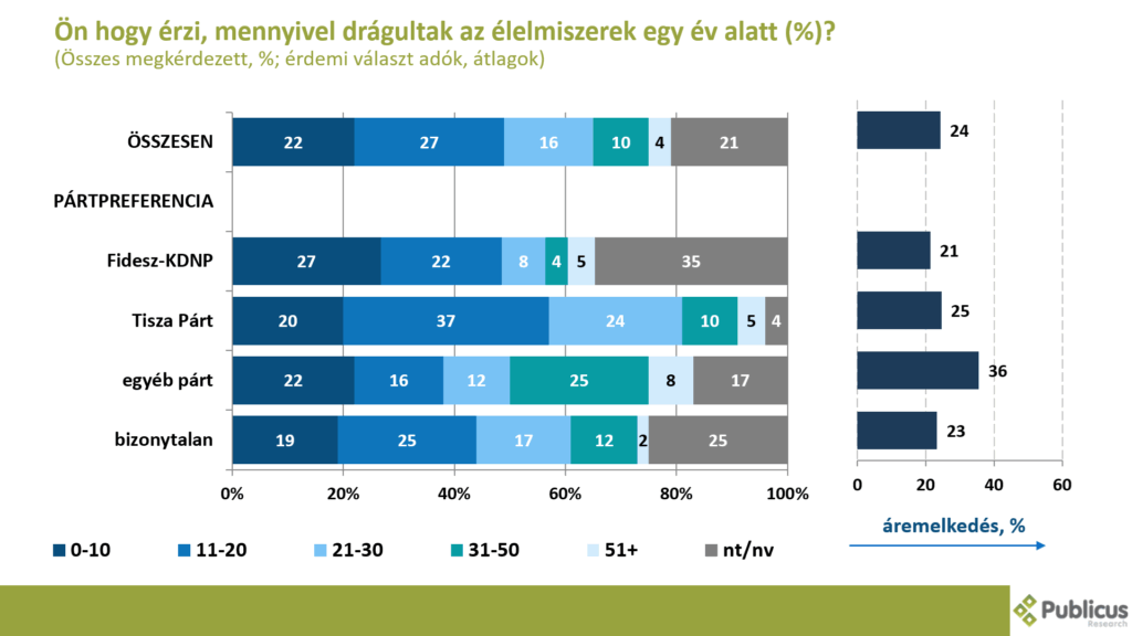 Az emberek által érzékelt áremelkedés az élelmiszereknél egy év alatt átlagosan 24 százalékos volt. Közel minden nyolcadik (14 százalék) válaszadó érzékelt 30 százaléknál is magasabb inflációt az élelmiszereknél. (Ezek a számok jóval elmaradnak a 2023-as márciusi adatoktól, amikor is az emberek 64 százalékos áremelkedést érzékeltek).