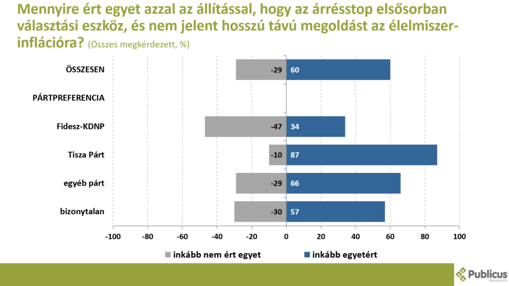 Tízből hat (60 százalék) megkérdezett inkább egyetért azzal a megállapítással, hogy az árrésstop elsősorban választási eszköz, és nem jelent hosszú távú megoldást az élelmiszer-inflációra. Így nyilatkozott a Tisza Párt szavazóinak a 87 százaléka, a bizonytalan szavazók 57 százaléka, illetve a Fidesz szavazók 34 százaléka.