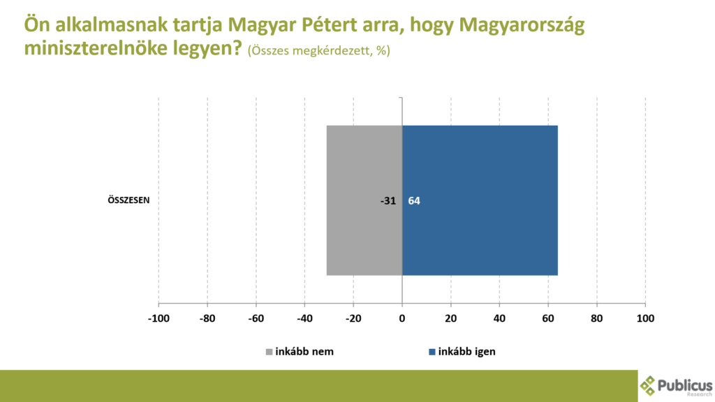 A választókerületben élők közel kétharmada (64 százalék) tartja Magyar Pétert alkalmasnak arra, hogy Magyarország miniszterelnöke legyen, még egyharmaduk (31 százalék), ezzel ellentétes véleményen van.