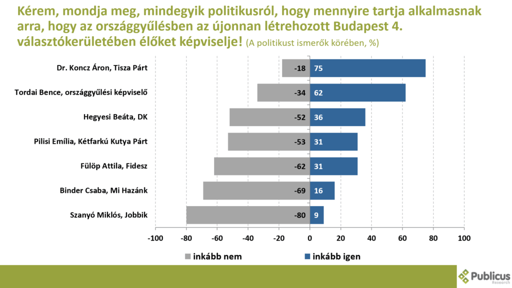 A válaszadók háromnegyede (75 százalék) szerint Dr. Koncz Áron, a Tisza Párt jelöltje inkább alkalmas arra, hogy az országgyűlésben az újonnan létrehozott Budapest 4-es számú választókerületben élőket képviselje. Tordai Bence kapcsán a megkérdezettek közel kétharmada (62 százalék) látja úgy, hogy a jelenlegi országgyűlési képviselő inkább alkalmas erre a feladatra.