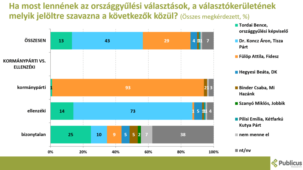 Azok körében, akik kormányváltást szeretnének, a válaszadók kétharmada szerint Koncz Áronnak, a Tisza jelöltjének van a legnagyobb esélye, hogy a helyi választókerületben legyőzze a Fidesz. Tordai Bencét a megkérdezettek 23 százalék választotta ugyanezen kérdés kapcsán.