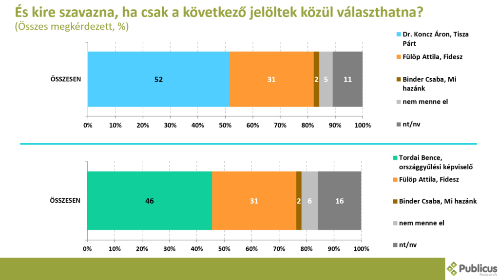 Az ellenzéki szavazók 73 százaléka Koncz Áronra, 14 százalék pedig Tordai Bencére szavazni (további 13 százalék vagy nem tudott, vagy nem akart válaszolni a kérdésre, vagy nem menne el szavazni, vagy pedig a többi párt jelöltjére szavazna).