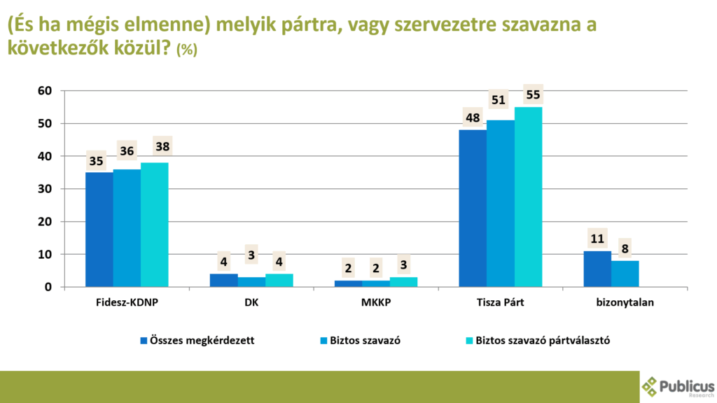 A Tisza Párt helyi szinten is vezet a pártok támogatottságában, a Fidesz jelentősebben lemaradva követi. A biztos szavazók körében a Tisza Párt 55 százalékos, míg a Fidesz 38 százalékos támogatottsággal rendelkezik. A választókerületben a DK 4 százalékot érne el, az MKKP pedig 3 százalékot. A pártválasztásukban bizonytalanok aránya az összes megkérdezett körében 11 százalék.
