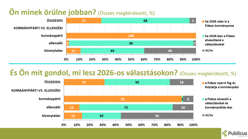 A megkérdezettek 68 százaléka annak örülne, ha a Fidesz 2026-ban elveszítené a választásokat, míg 27 százalék szeretné, hogy a jelenlegi kormánypárt 2026 után is hatalmon maradjon; 5 százalék nem tudott vagy nem akart válaszolni.