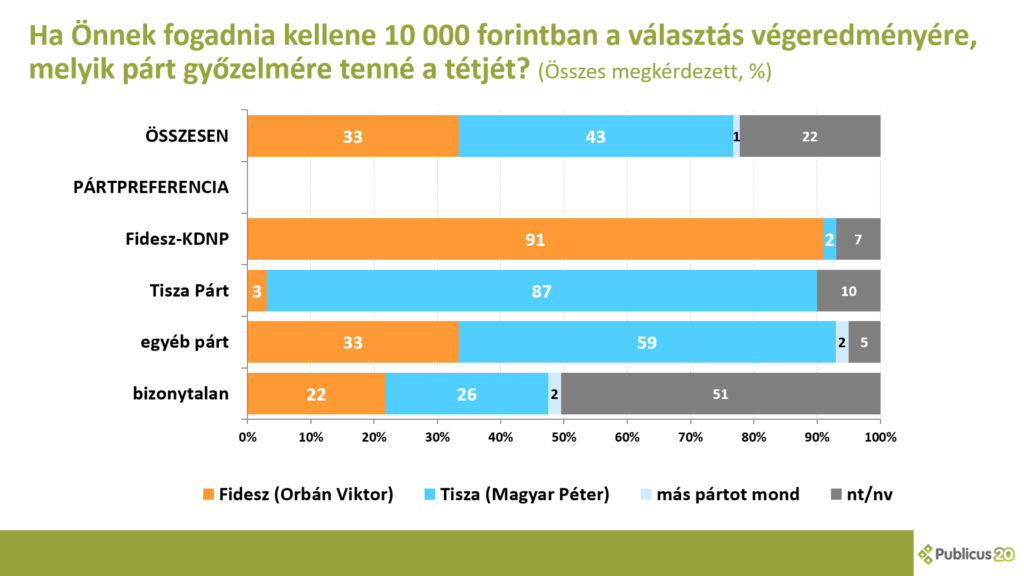 A 10.000 forintos teszt: Ha saját pénzről van szó, a választók 43 százaléka a Tiszára, és csak 33 százaléka a Fideszre fogadna. Ez a 10 pontos különbség a kőkemény realitásérzék diadala a politikai zaj felett.