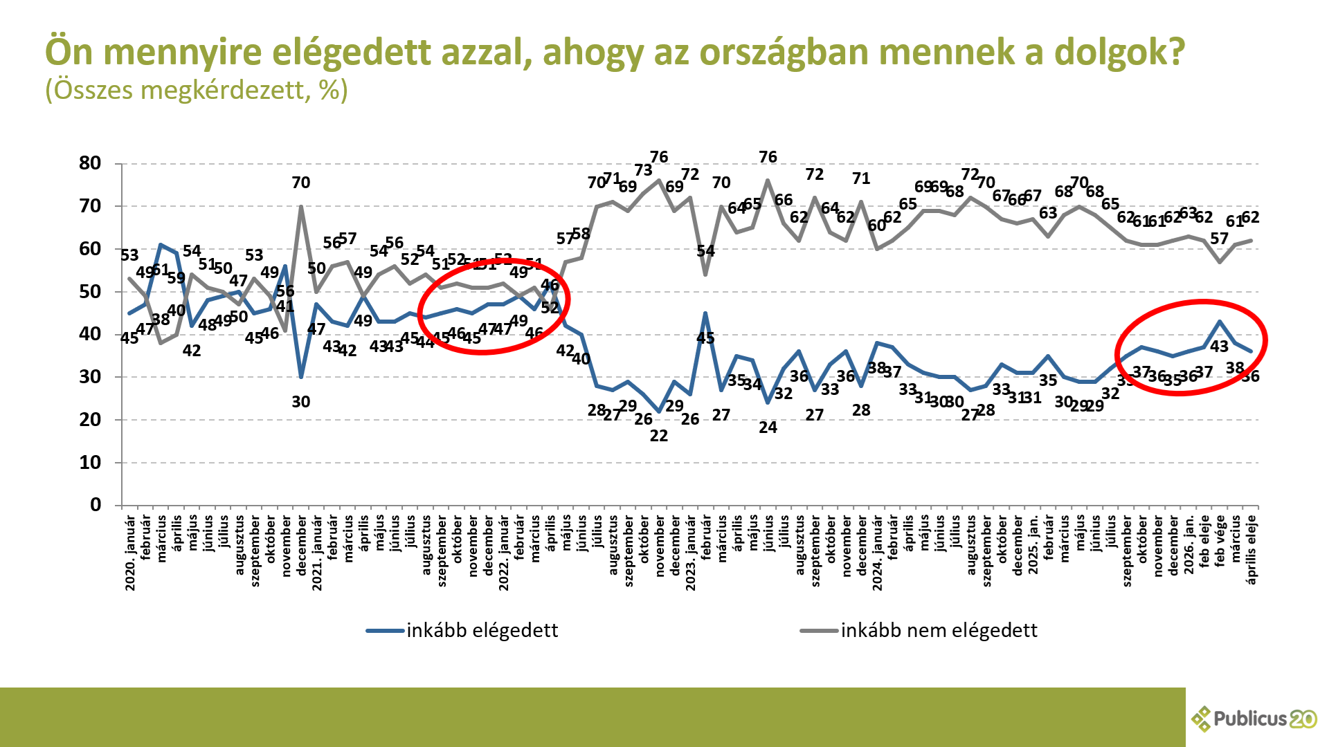 Sajátságos módon a kormányzati stratégia egyik tartóoszlopa is dőlt. Míg négy éve a választások előtti hatalmas pénzszórás átfordította a közhangulatot, most ez elmaradt. Az elégedetlenek aránya 62 százalékra nőtt, az elégedettség pedig mindössze 36 százalékon áll. Ez az adat jelentősen alacsonyabb, mint a legutóbbi választás idején. Bár a pénzosztásnak volt hatása, de a lendület kifulladt. Az emberek úgy érzik, hogy rosszabbul élnek, mint négy éve. Úgy tűnik, jelen helyzetben a választópolgárok hétköznapi megélése most erősebb volt a borítékoknál.