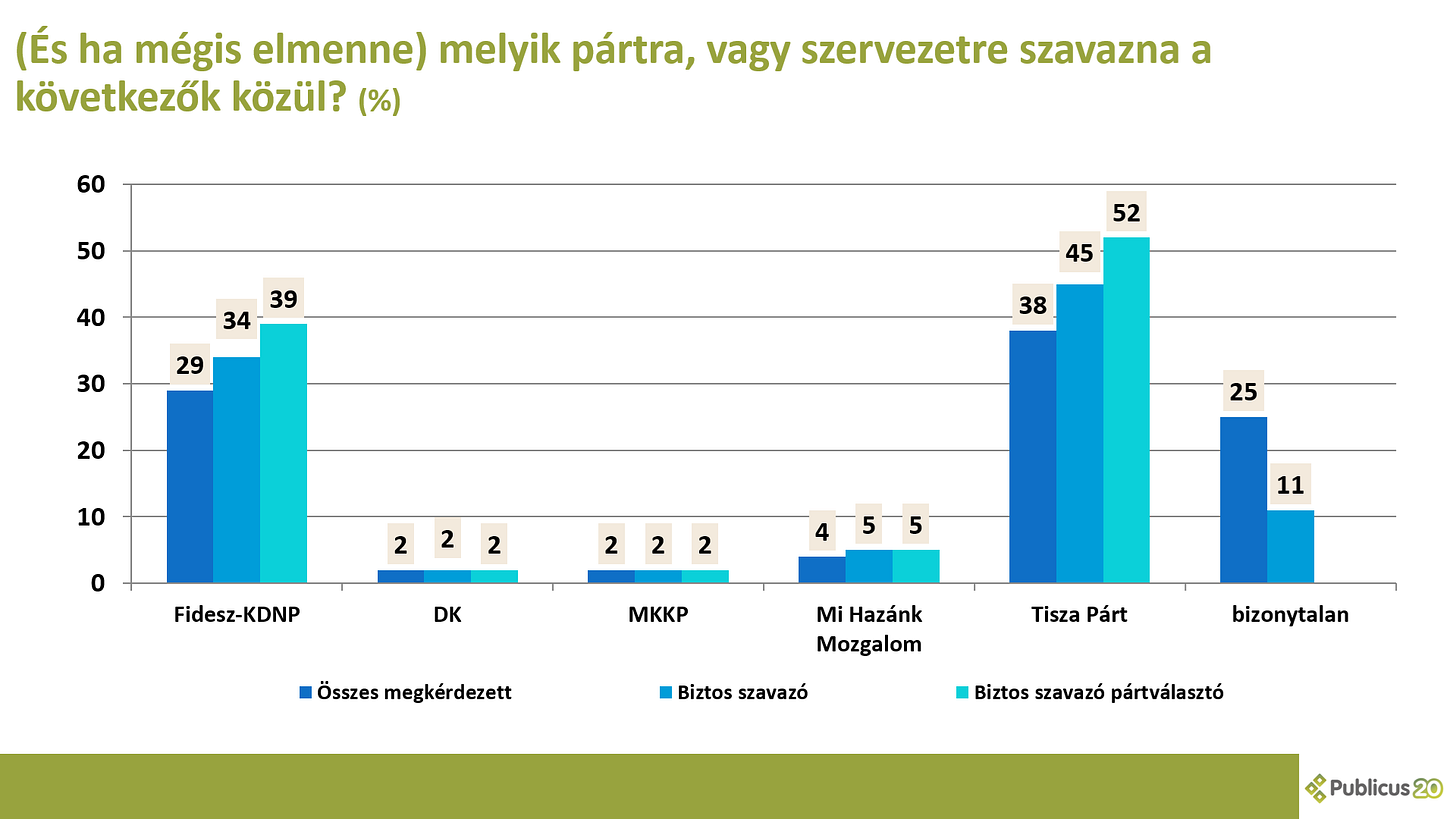 A biztos szavazó pártválasztók körében a Tisza Párt 52 százalékon, a Fidesz pedig 39 százalékon áll. Ez a 13 pontos különbség már túlmutat a hibahatáron és a tisztán listás győzelmen is. Azonban hiába +/- 3.1 százalék a hibahatár a hazai országos listás kutatásokban, ezt nagyon nehéz mandátumokra lefordítani. 10-20 választókerületben is 1000 szavazaton belül várható a különbség az két erős párt között, és nehéz megmondani, hogy azokban végül melyik fog nyerni. Így a mandátumok esetében a “hibahatár” ennél továbbra is sokkal nagyobb.
