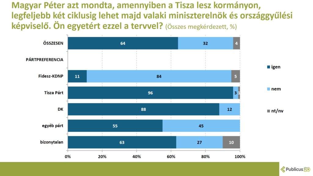 Magyar Péter azt mondta, amennyiben a Tisza lesz kormányon, legfeljebb két ciklusig lehet majd valaki miniszterelnök és országgyűlési képviselő. A megkérdezettek közel kétharmada egyetért ezzel a tervvel. Így nyilatkozott a Tisza Párt szavazóinak a 96 százaléka, a DK szavazók 88 százaléka, a bizonytalan szavazók 63 százaléka, illetve a Fidesz szavazók 11 százaléka.
