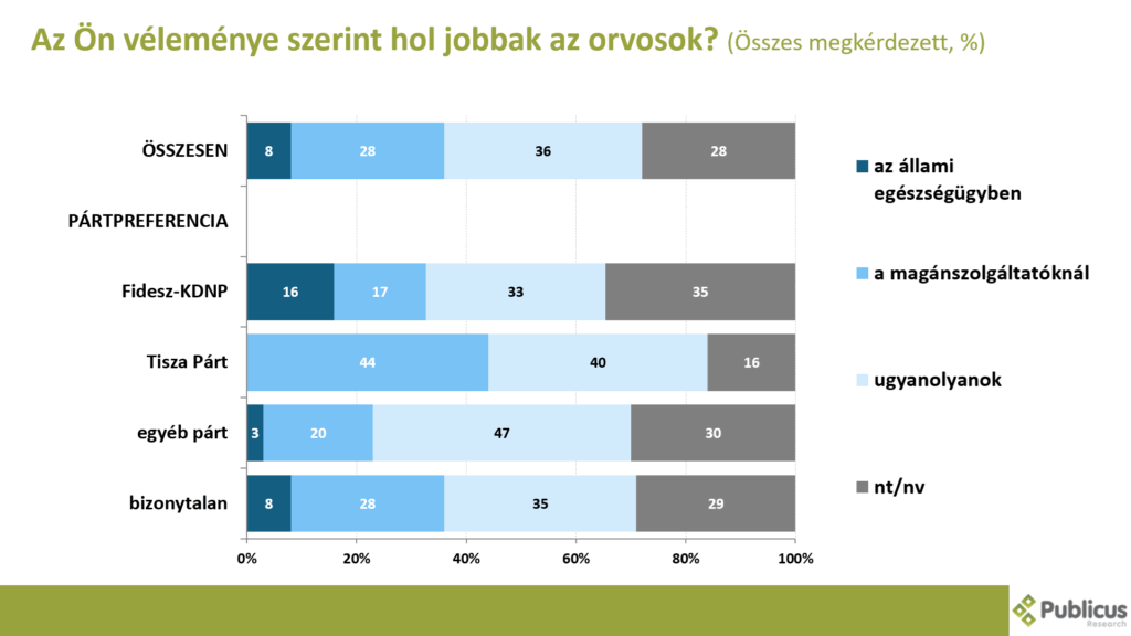 Tízből három (28 százalék) válaszadó szerint a magánszolgáltatóknál jobbak az orvosok. Így nyilatkozott a Tisza Párt szavazóinak a 44 százaléka, a bizonytalan szavazók 28 százaléka, illetve a Fidesz szavazók 17 százaléka.