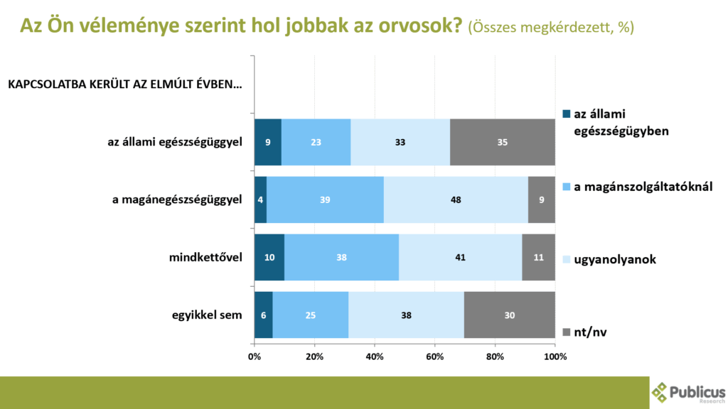 Azok közül, akik kapcsolatba kerültek mindkettővel, a válaszadók 10 százaléka szerint az állami egészségügyben, 38 százalék szerint pedig a magánszolgáltatónál jobbak az orvosok. Tízből négy megkérdezett szerint ugyanolyanok az orvosok mindkét helyen, illetve 11 százazék vagy nem akart, vagy nem tudott válaszolni a kérdésre.