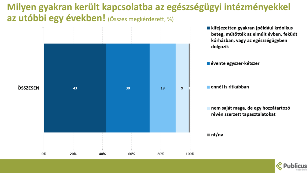 Tízből négy (43 százalék) válaszadó kifejezetten gyakran került kapcsolatba egészségügyi intézményekkel az utóbbi években. (például krónikus beteg, műtötték az elmúlt évben, feküdt kórházban, vagy az egészségügyben dolgozik)