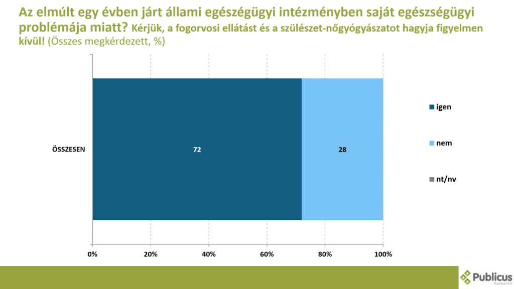 Tízből hét válaszadó (72 százalék) az elmúlt egy évben járt állami egészégügyi intézményben saját egészségügyi problémája miatt. (a fogorvosi ellátást és a szülészet-nőgyógyászatot figyelmen kívül hagyva).