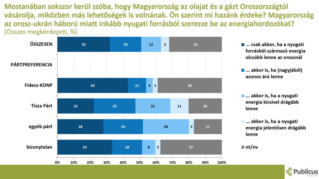 A válaszadók harmada (32 százalék) szerint Magyarország érdeke az, hogy csak akkor szerezzen be nyugati forrásból energiahordozókat, ha az olcsóbb az orosznál. Így látja a Fidesz szavazók 43 százaléka, a bizonytalan szavazók 33 százaléka, illetve a Tisza Párt szavazóinak a 22 százaléka.