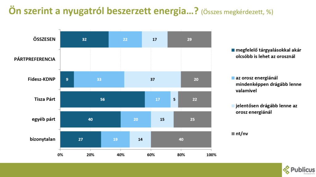 A válaszadók harmada (32 százalék) szerint a nyugatról beszerzett energia megfelelő tárgyalásokkal akár olcsóbb is lehet az orosznál. Így gondolja a Tisza Párt szavazóinak az 56 százaléka, a bizonytalan szavazók 27 százaléka, illetve a Fidesz szavazók 9 százaléka.