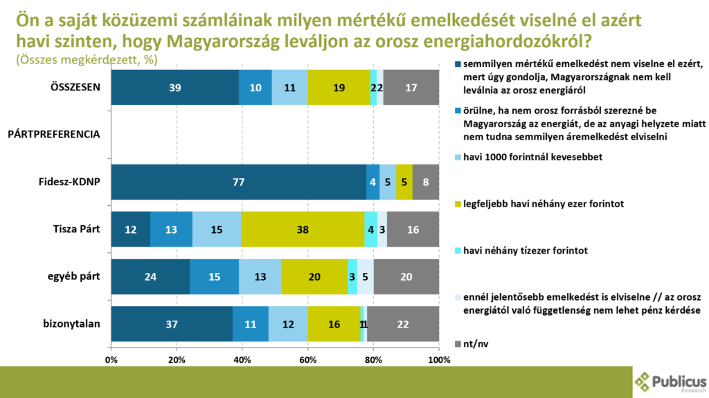 Tízből négy (39 százalék) válaszadó semmilyen mértékű emelkedést nem viselne el a közüzemi számlái kapcsán, mivel úgy gondolja, hogy Magyarországnak nem kell leválnia az orosz energiáról. Ezt közölte a Fidesz szavazók 77 százaléka, a bizonytalan szavazók 37 százaléka, illetve a Tisza Párt szavazóinak a 12 százaléka.