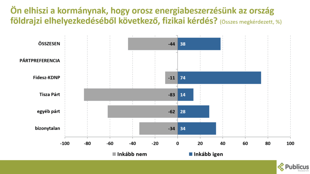 Többen vannak azok, akik szerint (44 százalék 38 százalék ellenében) inkább nem igaz az, hogy az orosz energiabeszerzésünk az ország földrajzi elhelyezkedéséből következő, fizikai kérdés. Így nyilatkozott a Tisza Párt szavazóinak a 83 százaléka, a bizonytalan szavazók 34 százaléka, illetve a Fidesz szavazók 11 százaléka.
