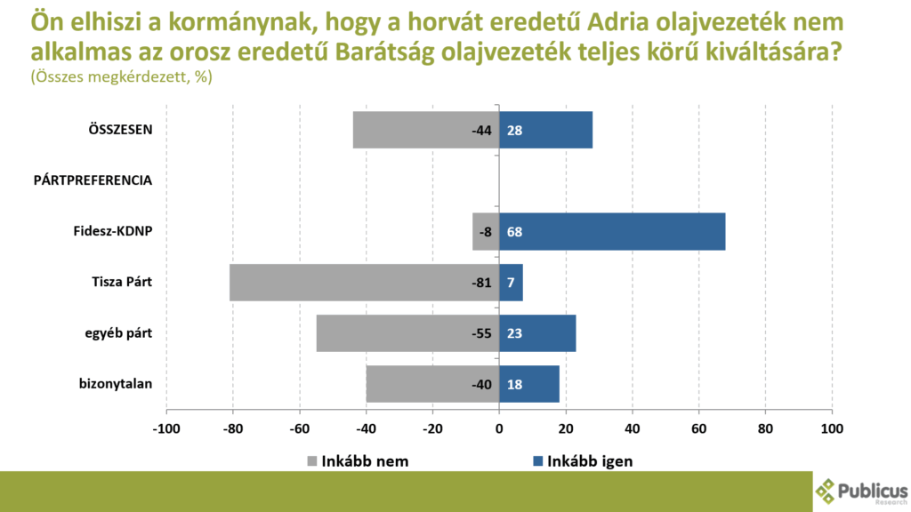 Szintén többségben vannak azok (44 százalék 28 százalék ellenében), akik inkább nem hiszik el a kormánynak, hogy a horvát eredetű Adria olajvezeték nem alkalmas az orosz eredetű Barátság olajvezeték teljes körű kiváltására.Ezt közölte a Tisza Párt szavazóinak a 81 százaléka, a bizonytalan szavazók 40 százaléka, illetve a Fidesz szavazók 8 százaléka.