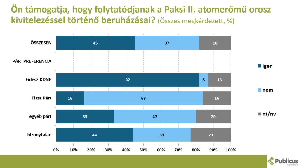 Mindezzel együtt többségben vannak azok (45 százalék 37 százalék ellenében), akik inkább támogatják, hogy folytatódjanak a Paksi II. atomerőmű orosz kivitelezéssel történő beruházásai. Ezt mondta a Fidesz szavazók 82 százaléka, a bizonytalan szavazók 44 százaléka, illetve a Tisza Párt szavazóinak a 16 százaléka.