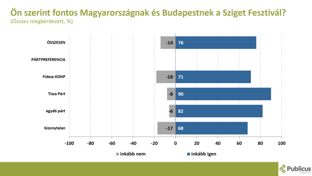 A válaszadók háromnegyede szerint inkább fontos Magyarországnak és Budapestnek a Sziget Fesztivál. Így gondolja a Tisza Párt szavazóinak a 90 százaléka, a Fidesz szavazók 71 százaléka, illetve a bizonytalan szavazók 68 százaléka.