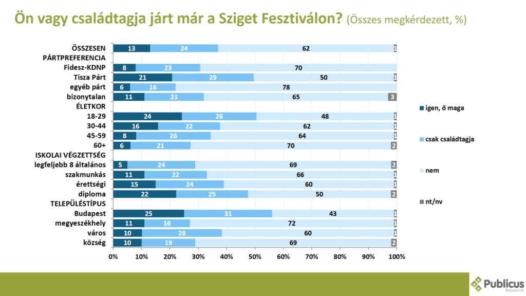 A válaszadók 13 százaléka járt már a Sziget Fesztiválon. Leginkább a Budapesten élők (25 százalék), a 18-29 év közöttiek (24 százalék), illetve a diplomások (22 százalék) nyilatkoztak így. Pártpreferencia alapján így nyilatkozott a Tisza Párt szavazóinak a 21 százaléka, a bizonytalan szavazók 11 százaléka, illetve a Fidesz szavazók 8 százaléka.