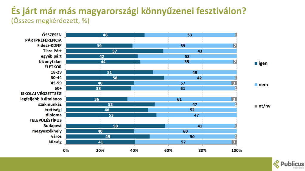 Minden második (46 százalék) válaszadó járt már más zenei fesztiválon. Leginkább a Budapestiek (58 százalék) és a kisebb városokban élők (49 százalék), a diplomások és a szakmunkások (53-52 százalék), illetve a 18-29 és közöttiek (51 százalék) és a 30-44 év közöttiek (58 százalék) nyilatkoztak így.