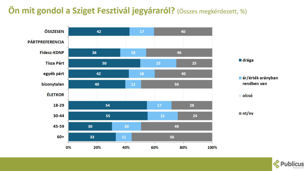 Tízből négy (42 százalék) válaszadó szerint drága a Sziget Fesztivál. Így gondolja a 18-44 év közöttiek 54-55 százaléka és a 45 évnél idősebbek több mint 30 százaléka, illetve pártpreferencia alapján a Tisza Párt szavazóinak az 50 százaléka, a bizonytalan szavazók 40 százaléka, illetve a Fidesz szavazók 36 százaléka.