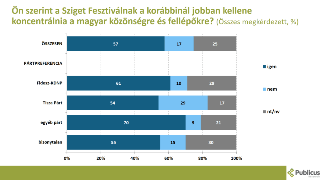 Tízből hat (57 százalék) válaszadó szerint a Sziget Fesztiválnak a korábbinál jobban kellene koncentrálnia a magyar közönségre és fellépőkre. Így nyilatkozott a Fidesz szavazók 61 százaléka, a bizonytalan szavazók 55 százaléka, illetve a Tisza Párt szavazóinak az 54 százaléka.