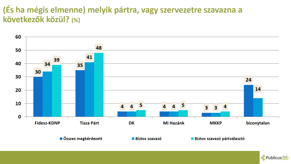 A parlamenti küszöböt a Mi Hazánk és a DK lépné át (5-5 százalék), illetve a Magyar Kétfarkú Kutyapártnak van erre még esélye (4 százalék). A többi parlamenti párt támogatottsága egyértelműen a belépési küszöb alatt van jóval jelenleg. A pártválasztásukban bizonytalanok aránya az összes megkérdezett körében 24 százalék.