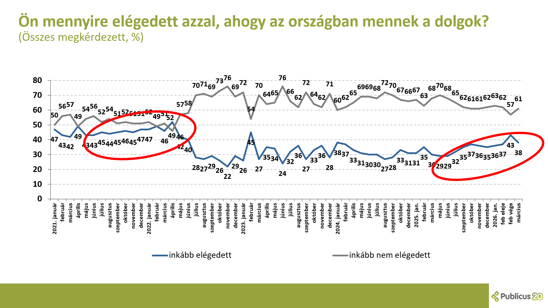 Tízből hat (61 százalék) válaszadó inkább nem elégedett azzal, ahogy az országban mennek a dolgok. Így nyilatkozott a Tisza Párt szavazóinak a 98 százaléka, a bizonytalan szavazók 61 százaléka, illetve a Fidesz szavazók 13 százaléka.