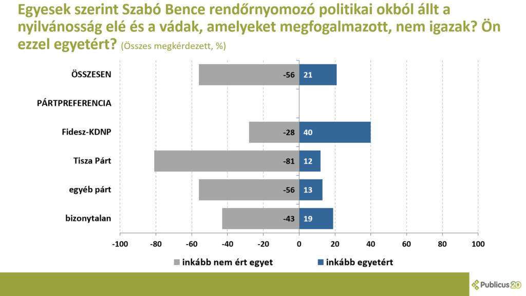 Egyesek szerint Szabó Bence rendőrnyomozó politikai okból állt a nyilvánosság elé és a vádak, amelyeket megfogalmazott, nem igazak. A többség (56 százalék) inkább nem ért egyet ezzel az állítással. Ezt mondta a Tisza Párt szavazóinak a 81 százaléka, a bizonytalan szavazók 43 százaléka, illetve a Fidesz szavazók 28 százaléka.