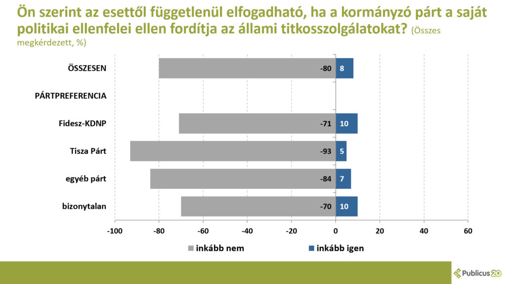 Tízből nyolc (80 százalék) megkérdezett szerint ettől az esettől függetlenül inkább nem elfogadható az, ha a kormányzó párt a saját politikai ellenfelei ellen fordítja az állami titkosszolgálatokat. Ezt mondta a Tisza Párt szavazóinak a 93 százaléka, a Fidesz szavazók 71 százaléka, illetve a bizonytalan szavazók 70 százaléka.