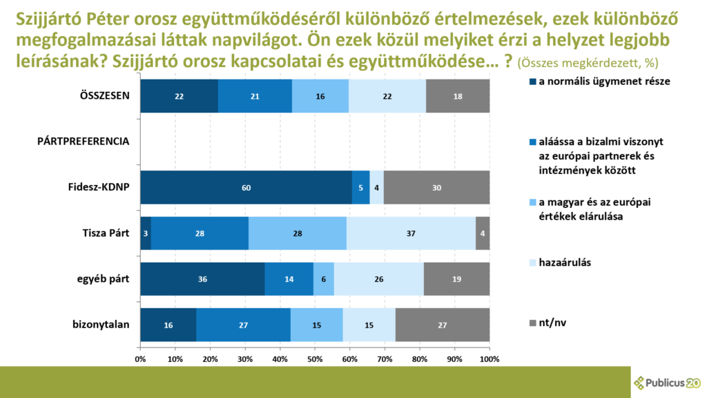 A válaszadók 22 százaléka szerint Szijjártó orosz kapcsolatai és együttműködése egyenesen hazaárulás. Így gondolja a Tisza Párt szavazóinak a 37 százaléka, a bizonytalan szavazók 15 százaléka, illetve a Fidesz szavazók 5 százaléka.