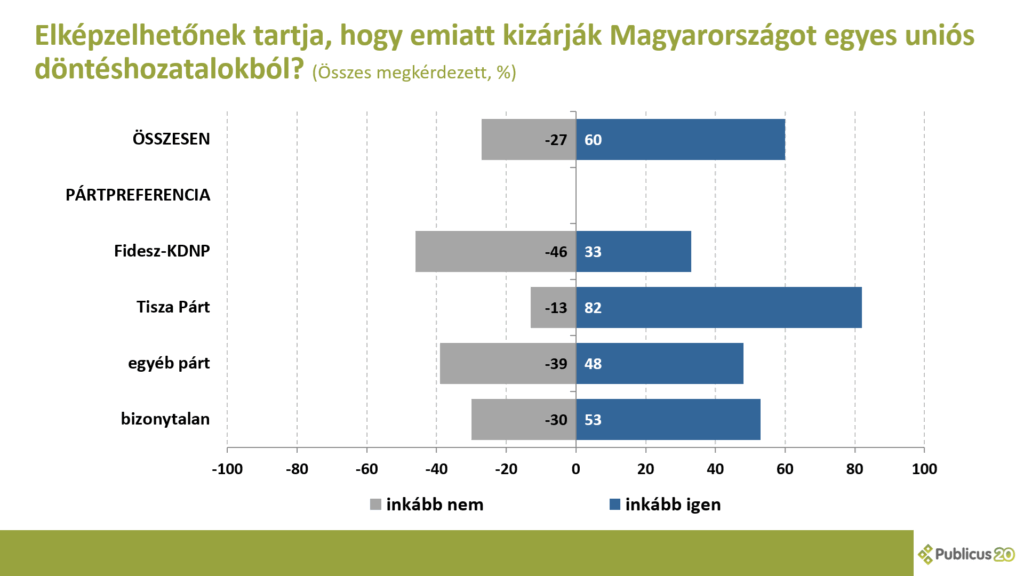 Tízből hat (60 százalék) válaszadó inkább elképzelhetőnek tartja, hogy emiatt kizárják Magyarországot egyes uniós döntéshozatalokból. Így gondolja a Tisza Párt szavazóinak a 82 százaléka, a bizonytalan szavazók 53 százaléka, illetve a Fidesz szavazók 33 százaléka.