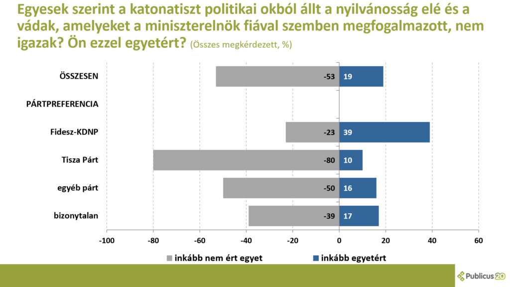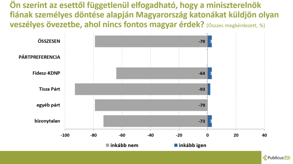 Tízből nyolc (79 százalék) válaszadó szerint az esettől függetlenül inkább nem elfogadható, hogy a miniszterelnök fiának személyes döntése alapján Magyarország katonákat küldjön olyan veszélyes övezetbe, ahol nincs fontos magyar érdek. Így gondolja a Tisza Párt szavazóinak a 93 százaléka, a bizonytalan szavazók 73 százaléka, illetve a Fidesz szavazók 64 százaléka.