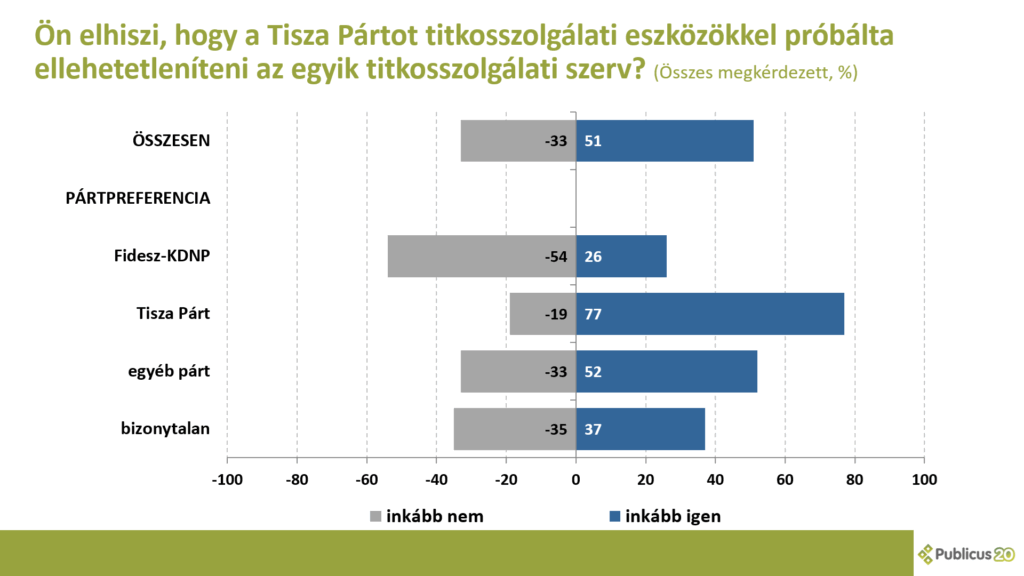 Az enyhe többség (51 százalék) inkább elhiszi, hogy a Tisza Pártot titkosszolgálati eszközökkel próbálta ellehetetleníteni az egyik titkosszolgálati szerv. Így nyilatkozott a Tisza Párt szavazóinak a 77 százaléka, a bizonytalan szavazók 37 százaléka, illetve a Fidesz szavazók 26 százaléka.