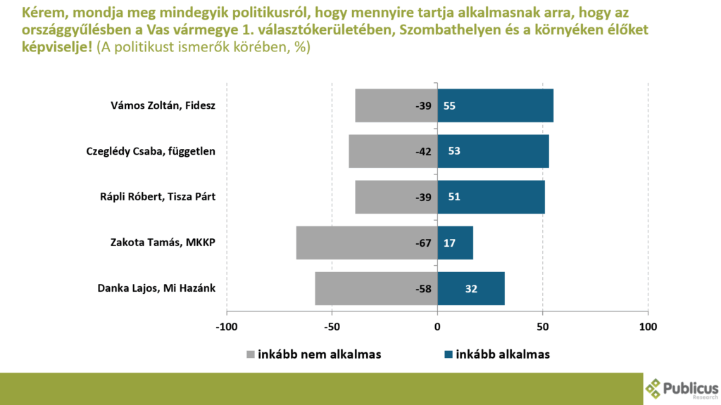 A válaszadók 55 százaléka tartja inkább alkalmasnak arra Vámos Zoltánt, 53 százalék Czeglédy Csabát, 51 százalék Rápli Róbertet, 32 százalék Danka Lajost, illetve 17 százalék Zakota Tamást, ,hogy az országgyűlésben a Vas vármegye 1. választókerületében, Szombathelyen és a környéken élőket képviselje.