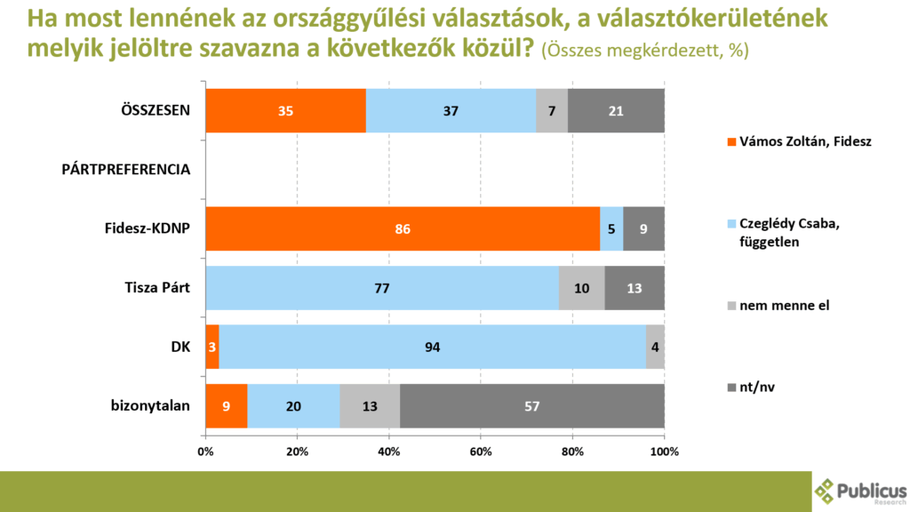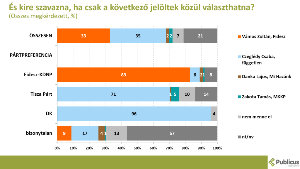 Czeglédyt tartják esélyesebbnek a DK szavazók 75 százaléka, a Tisza Párt szavazóinak a 36 százaléka, a Fidesz szavazók 32 százaléka, illetve a bizonytalan szavazók 31 százaléka.