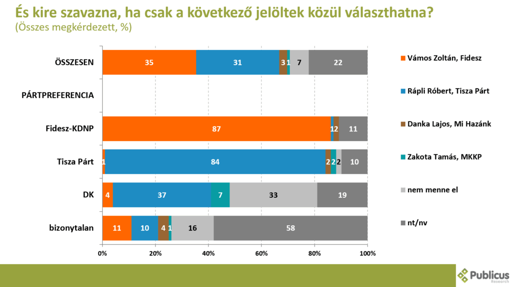 A válaszadók ötöde (21 százalék) szerint Rápli Róbertnek van a legnagyobb esélye a győzelemre. Így nyilatkozott a Tisza Párt szavazóinak az 56 százaléka, a DK szavazók 16 százaléka, a bizonytalan szavazók 8 százaléka, illetve a Fidesz szavazók 2 százaléka.