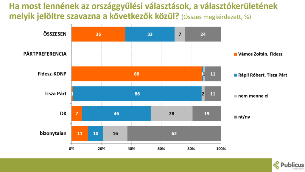 Tízből közel négy (37 százalék) megkérdezett szerint Rápli Róbertnek van erre a nagyobb esélye. Ezt mondta a Tisza Párt szavazóinak a 47 százaléka, a bizonytalan szavazók 18 százaléka, illetve a DK szavazók 18 százaléka.